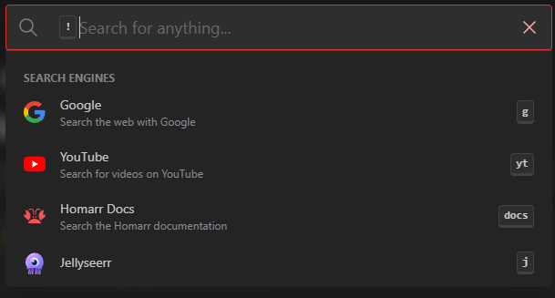 The template must be a valid URL that incldues the %s placeholder. Homarr will replace the %s with the term that the user entered.